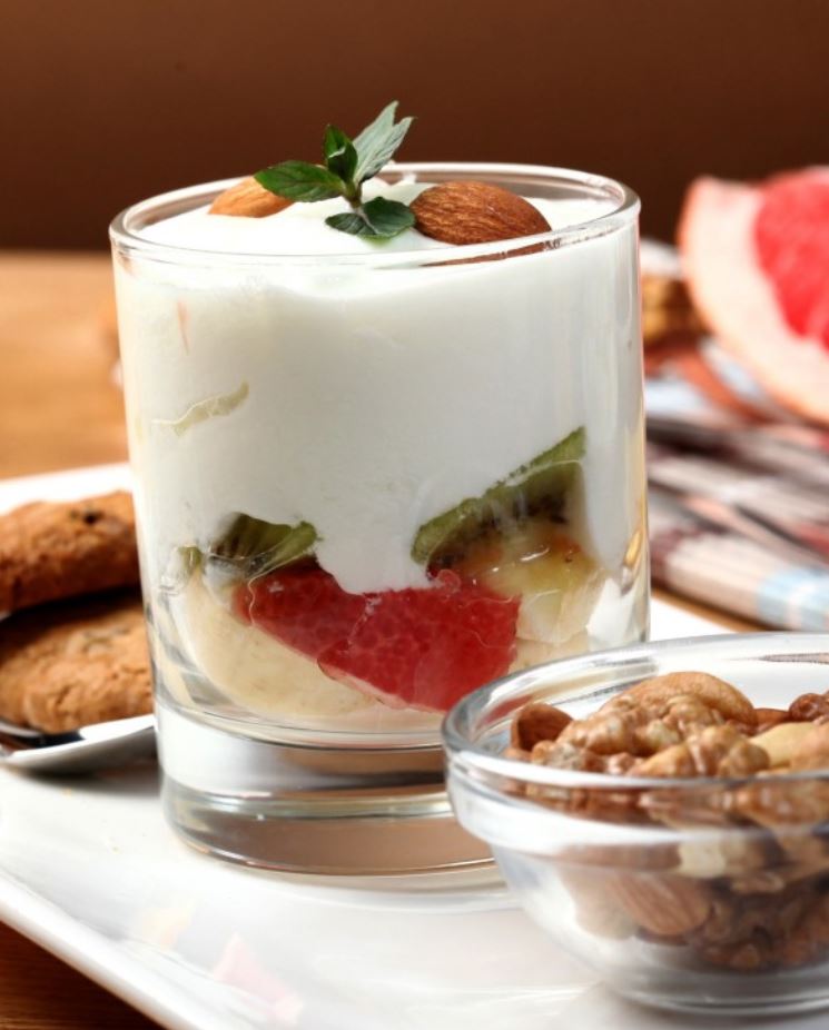 3.Top the yogurt with the granola, banana, strawberry and pineapple.